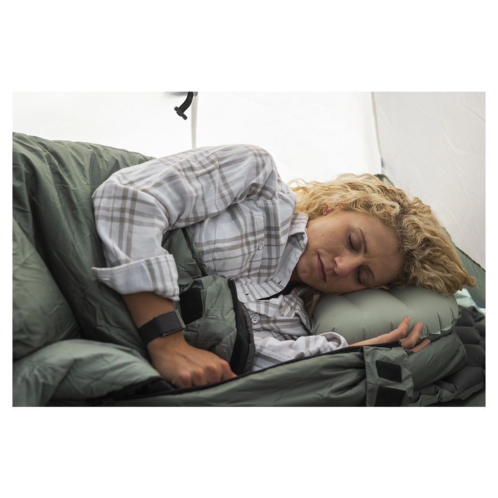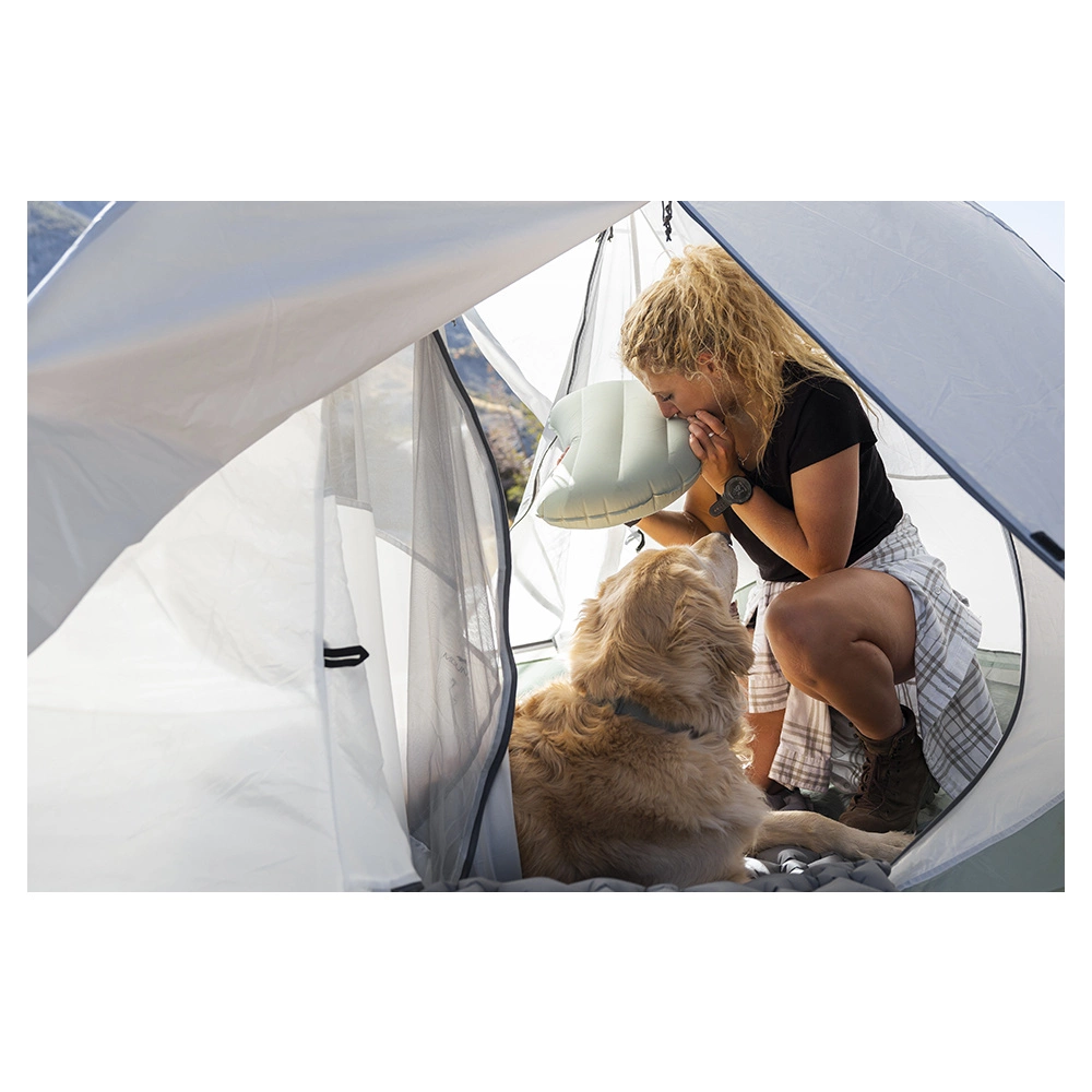 The ALPS Mountaineering Vice Pillow provides comfort and convenience in an environmentally friendly way. Made from recycled 30D polyester fabric in an attractive Iceberg Green. The soft brushed feel provides comfort and peaceful quiet when sleeping. The flat TPU valve allows for rapid inflation and deflation. When deflated, the Vice stores in the included small stuff sack also made from recycled material. The inflated size of 17” X 12” X 5” and arched shape make it a perfect fit to place in a hooded sleeping bag. Weighing on 3.8 ounces makes it perfect for trail hikes.